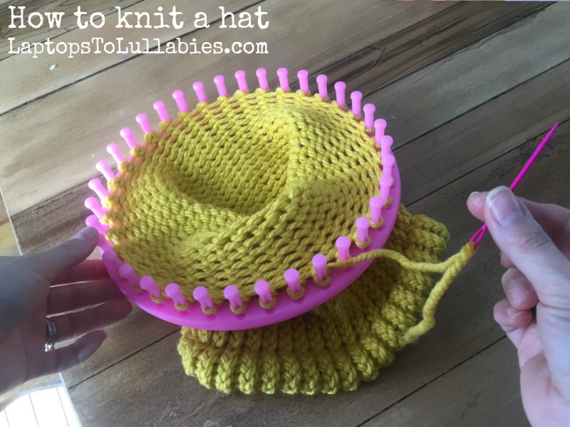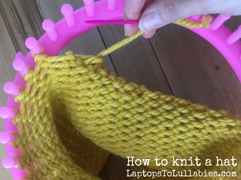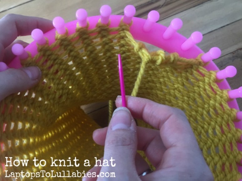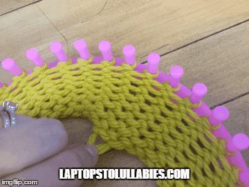 See the part you’ve already knit that’s hanging down inside your loom, like a wide knitted tube? It has little loops around the very bottom of it.