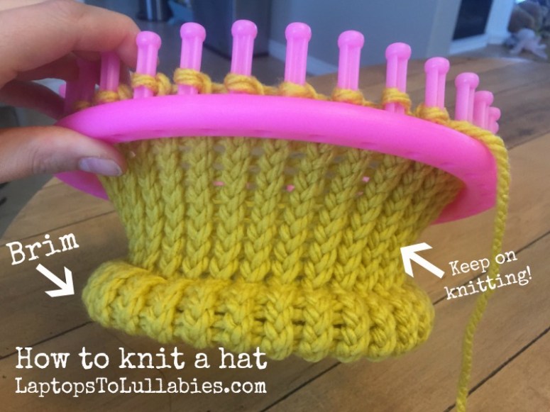 Take those loops and carefully bring them back up to the loom, sliding each one on the closest peg. This doubles up what you’ve made so far (which makes the brim nice and thick).Then continue knitting as usual (Steps No. 3 and 4) to make the rest of your hat.