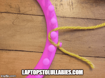 To “cast on” (which, don’t worry, is much easier on a loom than on slippery knitting needles), take your yarn, wrap it loosely around the first peg clockwise (to the right of the anchor peg) and then move to the next peg and wrap it clockwise. Keep doing this until you’ve moved around the whole circle and are back to where you started. Do this one more time (making two rows) and then you’re officially “casted on.”