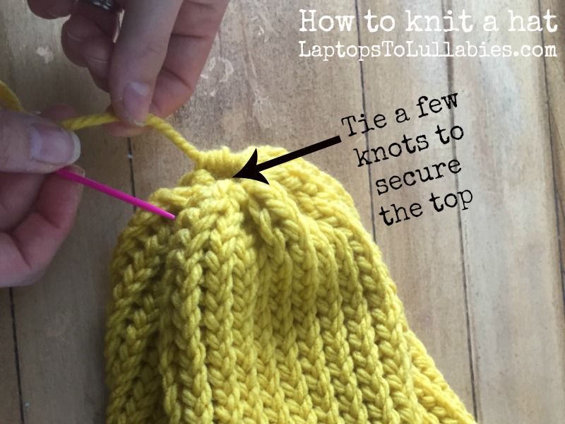 Does it look like a hat and you’re ready to finish it? I had no idea how this was going to work because our first hat was a giant tube that wasn’t getting any narrower, but apparently you “close” the hat by gathering all of the stitches around the top and pulling it tight.