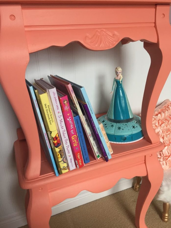 I painted the wood strips coral so they blended into the shelves, and then I was ready to style them! It was fun to arrange my daughter’s books and figurines along with a few picture frames I’d painted.