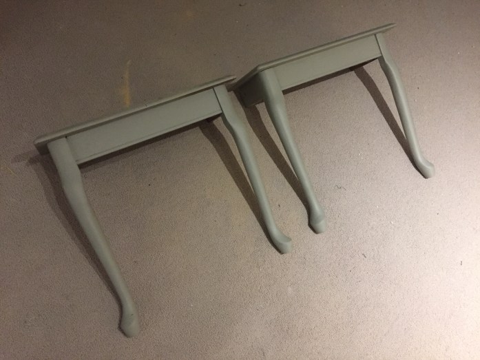 Then I spread out a dropcloth and started painting all four of the table-halves — tops, bottoms and underneath, since most nooks and crannies would be visible.