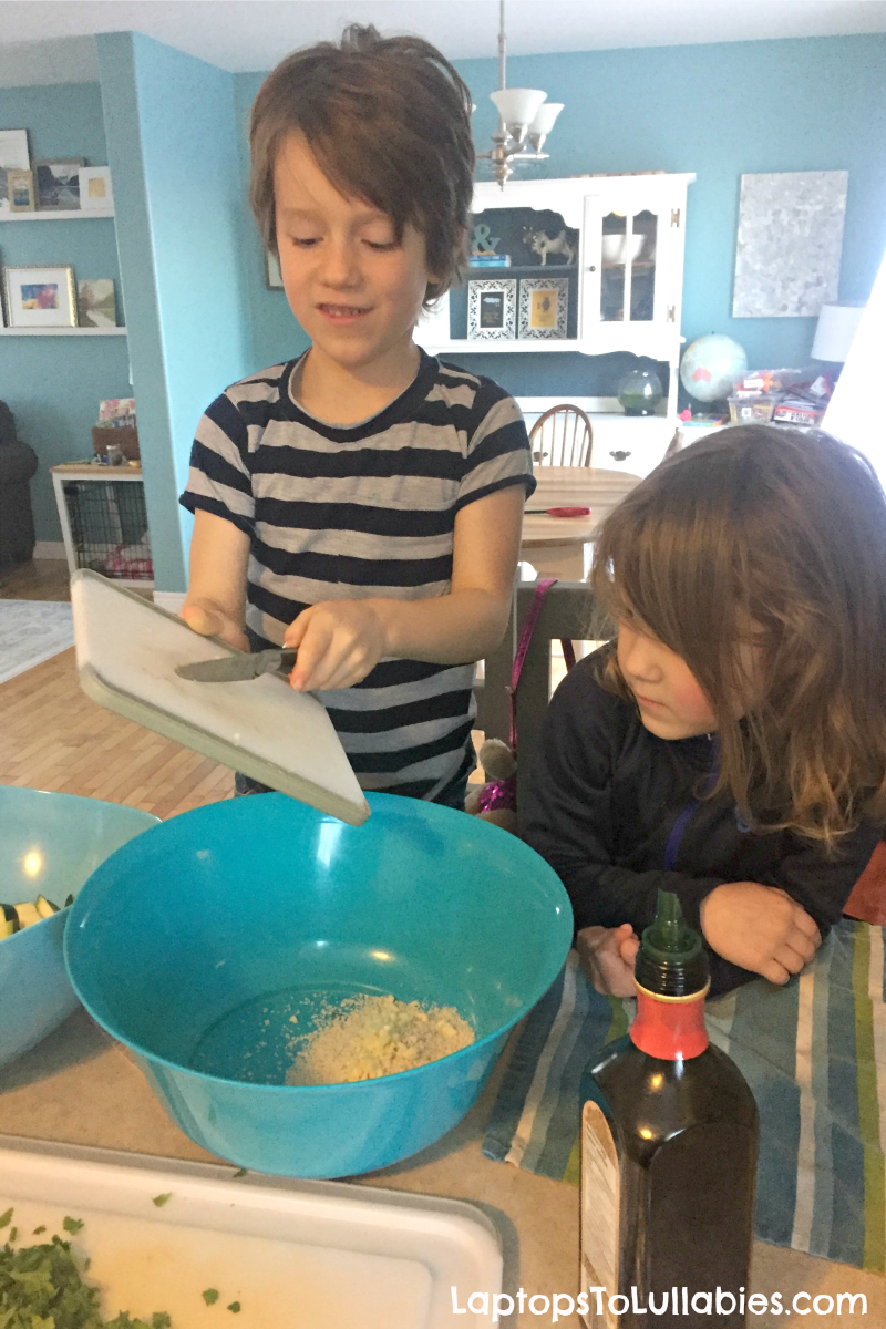 We also learned new SKILLS, which surprised me. We had to zest lemons and limes (using our cheese grater because we’re not fancy and do not own a zester) as well as the ginger, and it was fun! The kids even tried and didn’t grate their fingers, so it was a win all-around.