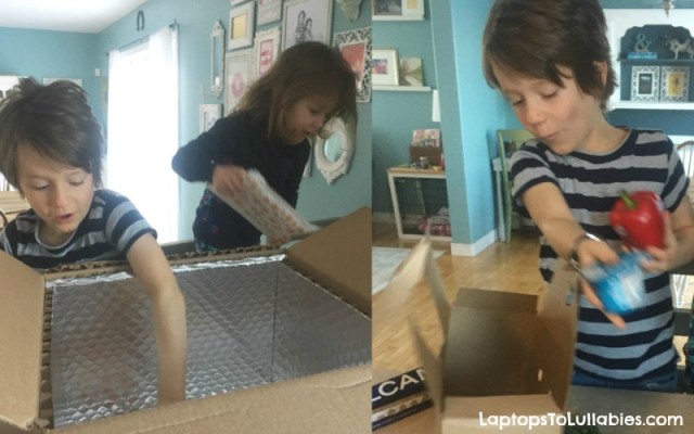 Have you ever seen two more excited children holding YOGURT and a red pepper?! (Two things we buy weekly, by the way.) D and C were thrilled when our big HelloFresh box arrived on a Tuesday and couldn’t wait to tear into it.