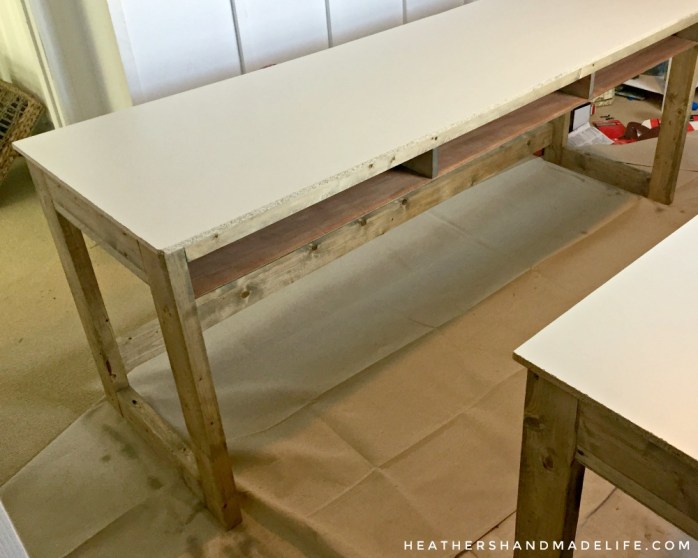 Once the stain was dry, the next step was finishing the playing surface. We picked white melamine plywood sheets because that’s what we used to build my custom L-shaped desk and I love how that looks. We used L brackets to keep them from moving around or slipping off the bases, but opted not to screw them in so they’re easy to remove if we move the tables around.