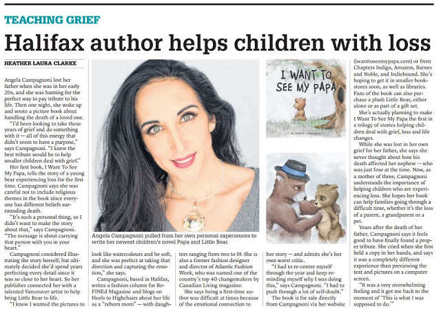 My story on the lovely Angela Campagnoni ran today, so please check out her new book helping children deal with loss. It’s beautiful and the illustrations — those bears with tears in their eyes!!! — are perfection.
