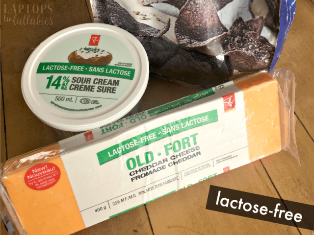 The last taste-test was with the lactose-free products: President’s Choice Lactose-Free Sour Cream, and President’s Choice Lactose-Free Old Cheddar Cheese, served with yummy blue corn tortilla chips.