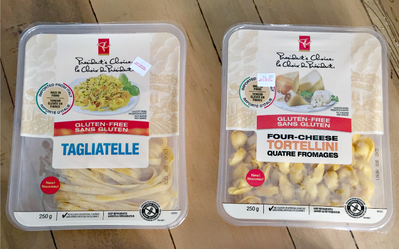 We started with the gluten-free pasta, since we love pasta. I boiled two pots of water and made President’s Choice Gluten-Free Tagliatelle (it looked like linguine to me, but I’m no chef) and President’s Choice Gluten-Free Four-Cheese Tortellini.