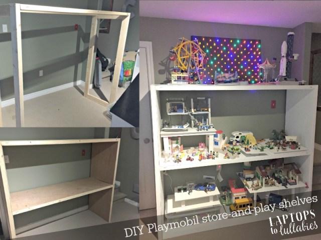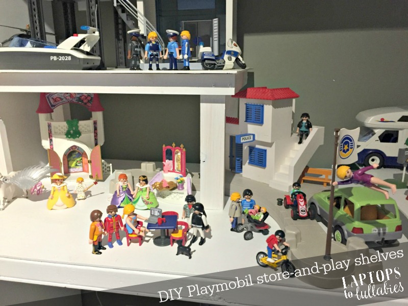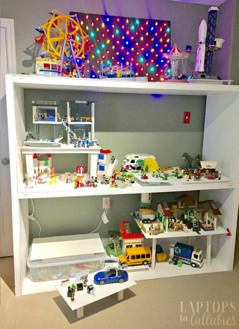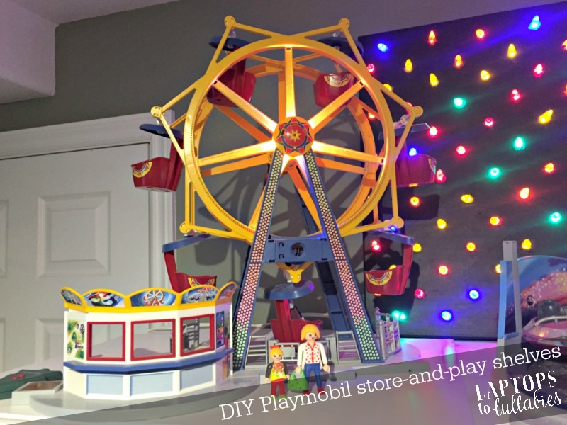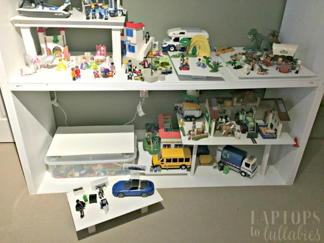 Now, when they want to play with the ferris wheel, the rocket ship, or anything else on the top shelf, I just lift down those platforms for them. It’s easy to rotate sets around because everything’s sitting on its own platform, and sometimes they’ll spread a set out on the carpet so they can expand their game.