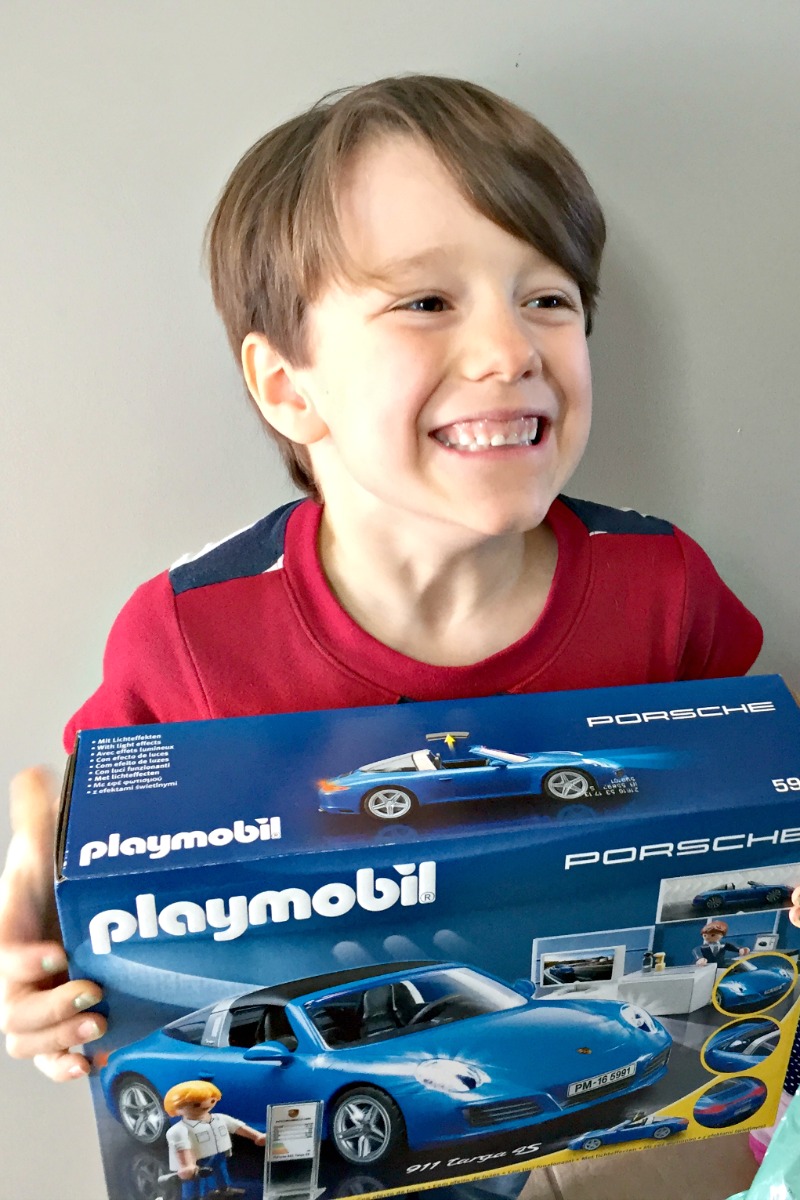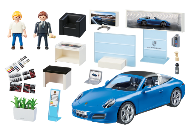 See the Playmobil set here at the bottom, sitting on the carpet? That’s our newest addition: the Porsche 911 Targa 4S and showroom!