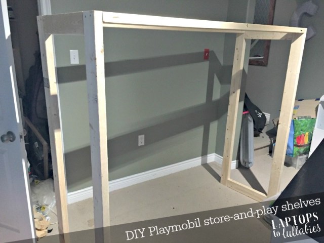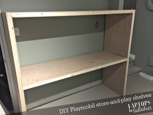 I knew the perfect spot for our Playmobil shelving would be a narrow area of the basement family room, squeezed between a doorway and a stairwell, so we measured to make sure we could use every inch.