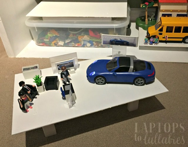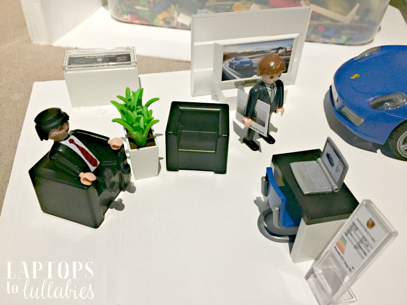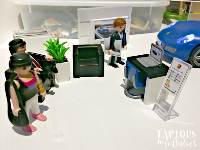 It didn’t stay a “set” for long, of course, because they other Playmobil people had to be invited in for dealership tours so they can sit in the comfy armchairs, “watch videos” about the Porsche, and then go for a test-drive.