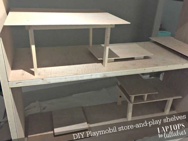 The only annoying part of this project was the painting. Oh, the painting. I was determined to have chunky, all-white shelving as a backdrop for the colourful Playmobil sets so it would look like a fancy toy store. Unfortunately, that meant many coats — for the shelves and all of the platforms.