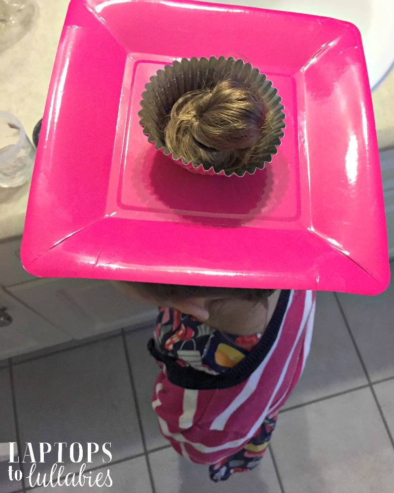 4. Slip the ponytail through the hole in the cupcake liner, twist the ponytail into a bun, and wrap it with an elastic.
