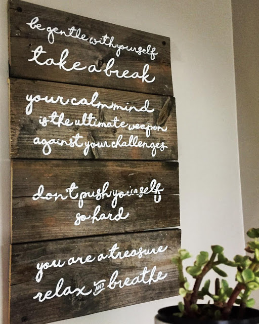barnboard (sorta) sign for our upstairs bathroom. I found all of the quotes on Pinterest, here and there, and mixed them together to create calming affirmations.