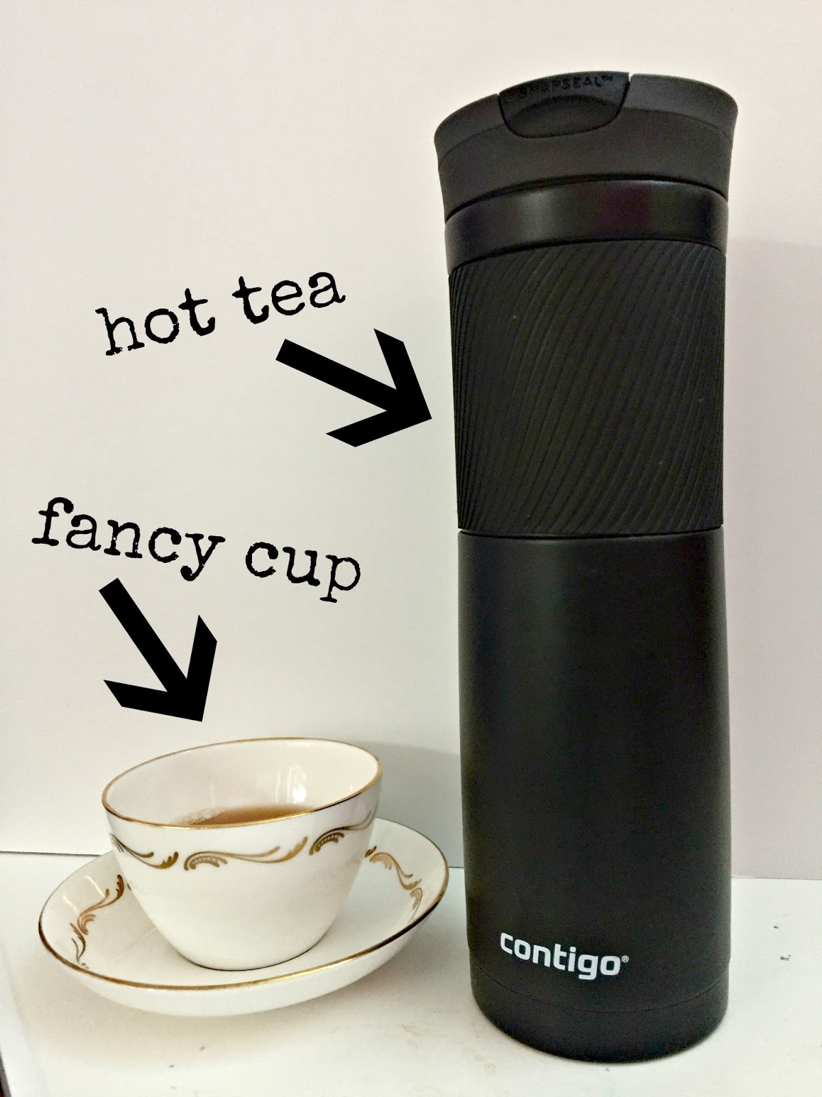 I’ve started bringing it downstairs to my office instead, filled with hot tea (and a splash of milk), and unsnapping it to pour a few sips of tea into a pretty little teacup. I drink what’s in the cup, go back to what I was working on, and the tea’s still hot the next time I pour a bit.