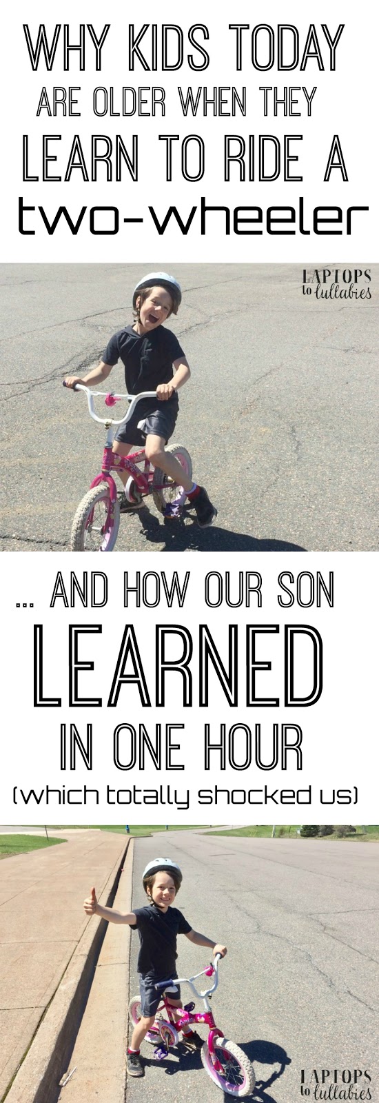 I felt a little better when I learned that he wasn’t alone. Hardly any of his friends — all six years old — knew how to ride a two-wheeler. My friends and I compared our own stories of tearing around on our two-wheelers as little five-year-olds, and we decided there must be a reason that our own kids were “behind” on this particular milestone.