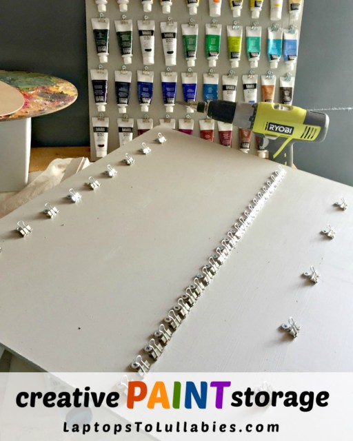 So I took a piece of plywood, trimmed it to size with my jigsaw, painted it a light grey (Fusion Mineral Paint’s “Putty”) and used tiny screws to add a ton of binder clips — these ones from Staples.
