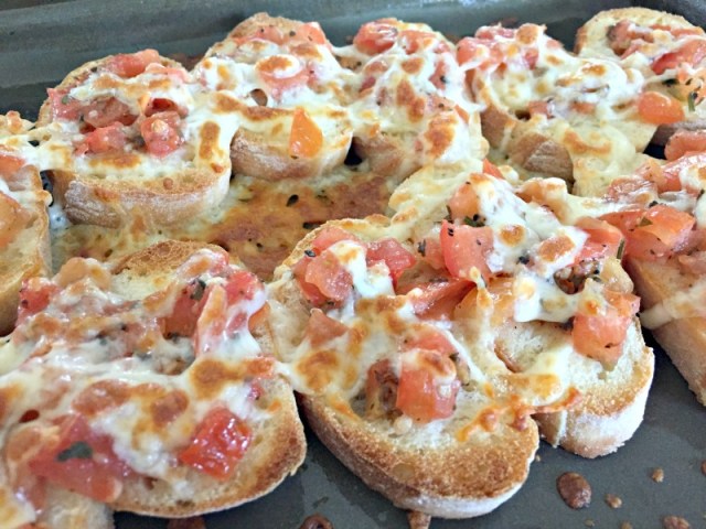 Baguette rounds toasted with fresh tomatoes and garlic.