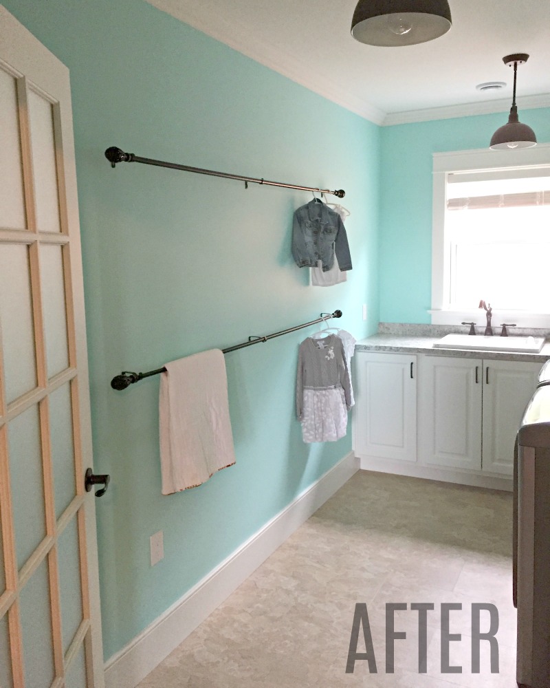 It’s a good-sized space, for a laundry room, but we didn’t want to crowd it with a huge fold-out rack. Luckily, there was a big empty wall that was begging for something interesting.