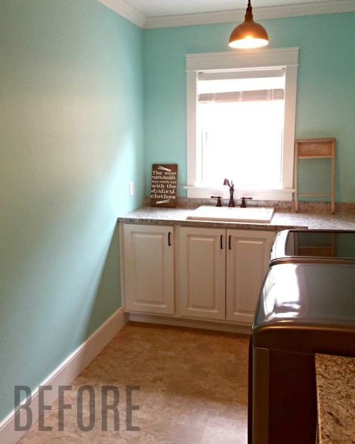 Now, this house has a beautiful, bright laundry room that’s truly the stuff of Pinterest dreams: a deep white sink, farmhouse light fixtures and a washer and dryer set that give me serious appliance envy.