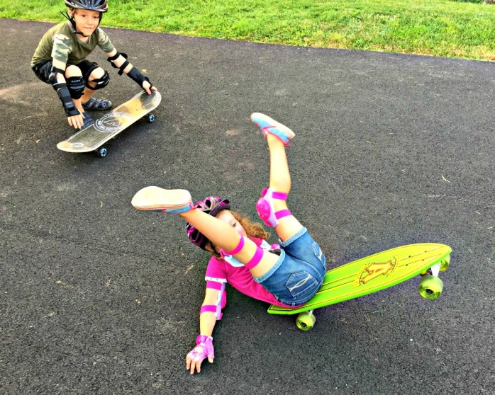 My only skateboard experience during elementary school was sitting on one and motoring it around with my feet. It would never have occurred to me to STAND UP on that scary, skinny board with little wheels. I mean, I’d fall! Immediately!