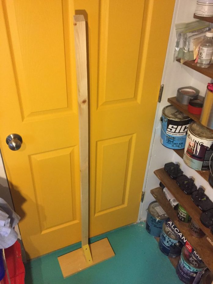 I started with a stand for our son’s clothing, and screwed a simple base (two short 2×2” pieces) onto a long 2×2” board. It wasn’t the steadiest thing, but it would work. But how were the clothes going to hang on it?
