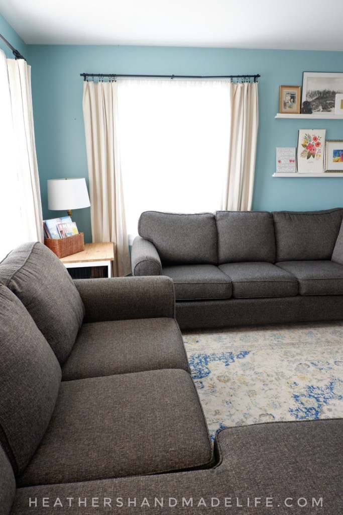 Despite the living room being the space we host company, the space you see as soon as you walk in the front door, AND the space we’ve spent the most money on furnishings — a sectional and a huge area rug — somehow replacing the curtains just . . . never felt like a priority?