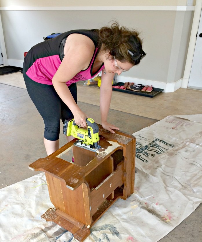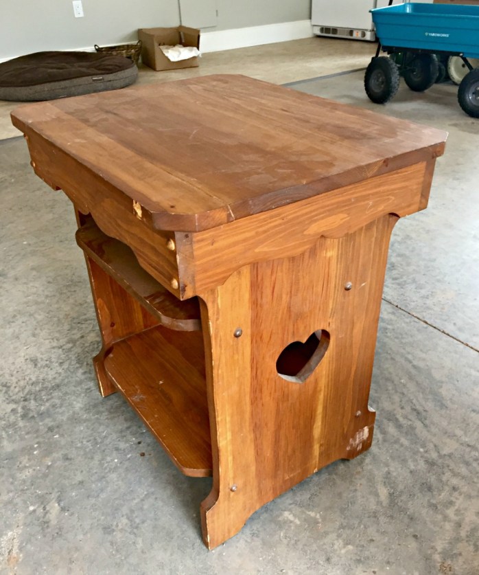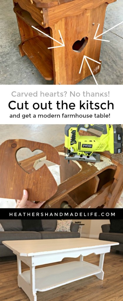 But this wasn’t just a straightforward painting job. The tables had kitschy heart cut-outs on each side. My friend loves the casual farmhouse look, but wasn’t a fan of the cutesy country flourishes. That meant we had six hearts to break — er, remove.