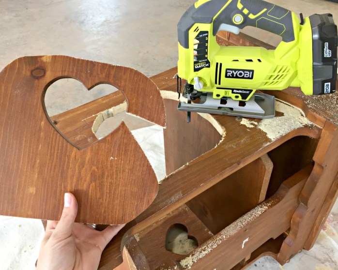 So I drove out to Debert, armed with my cordless Ryobi ONE jigsaw* and a bag of extra batteries. I sketched a rectangle to become the new cut-out, popped on my safety goggles and then plunged the sharp blade into the first heart — ugh, that sounds violent …