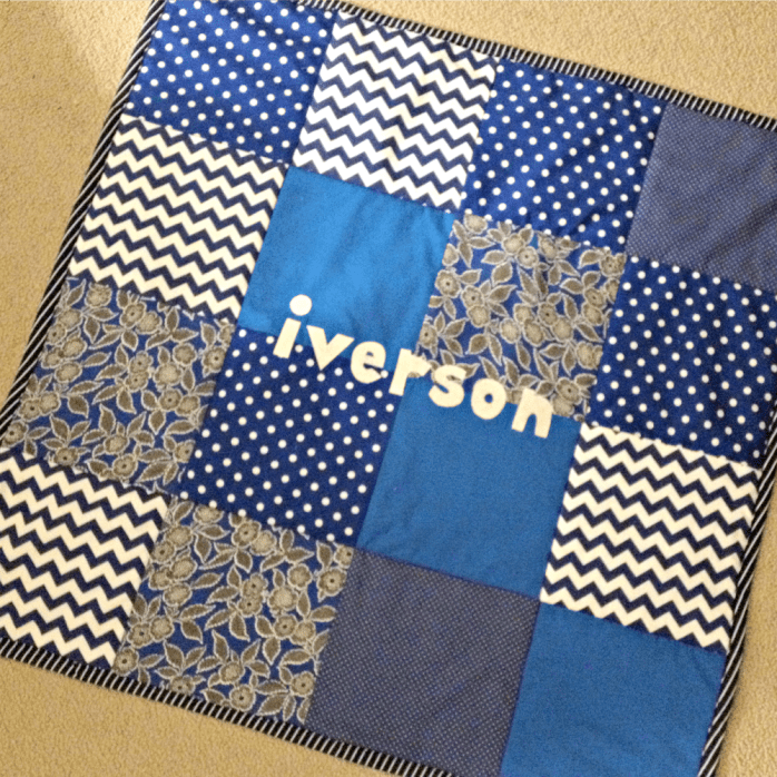 When my friend had her baby boy a few years back, I’d sewn him a little blue baby quilt with his name appliqued on the front.