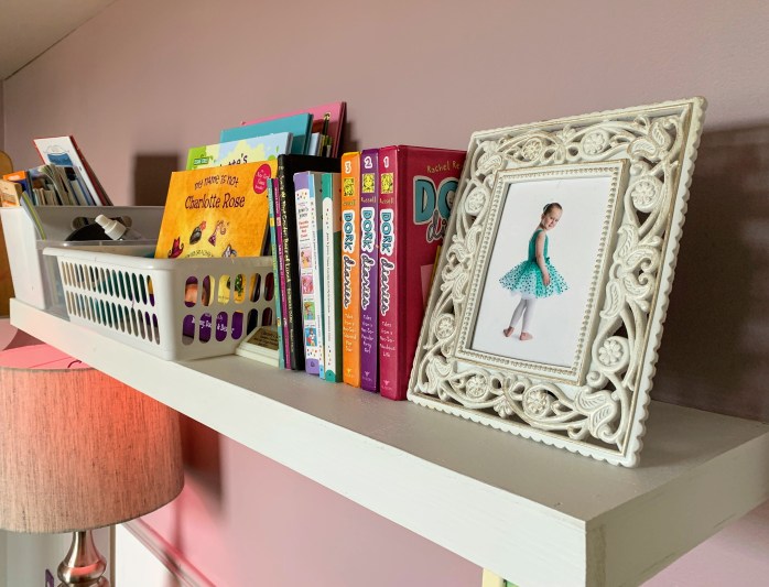 Now, when I’ve built floating shelves on my own, I’ve attached them to the wall using tiny L-brackets — which aren’t visible once the shelves are decorated with picture frames, bins, etc.