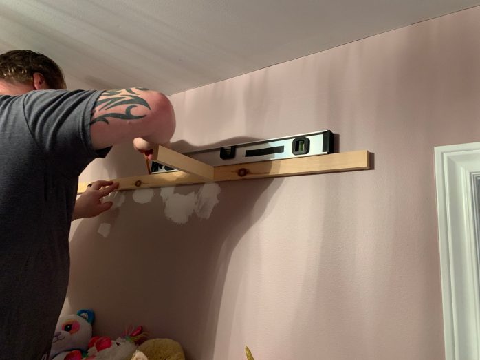 When the shelves were ready to install, we held the final piece of each rectangle against the wall — the remaining strips of 1×2 — levelled them, screwed them into studs, and then slid the shelves neatly over their missing piece. Then we screwed up (or down) through the shelf, into the board secured to the wall.