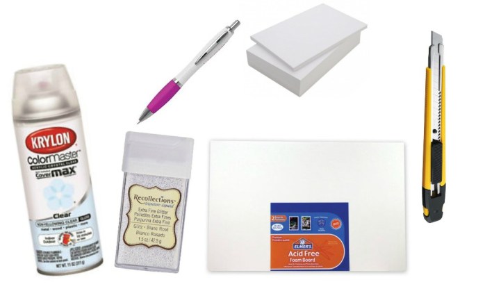 I sprayed it lightly — using another piece of foam core for overspray — and sprinkled it with white glitter. Ahhhhhh.