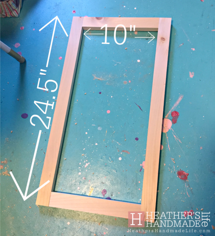 I grabbed a 1×2 board from my studio and quickly assembled a frame: two vertical boards measuring 24.5” and two horizontal boards measuring 10” to slip in between.