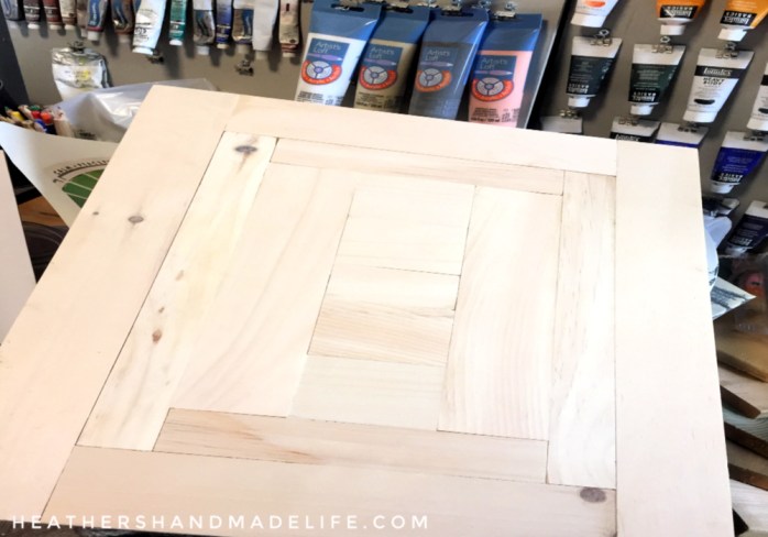 My handy husband was ready with my tabletop insert, and he’d done a wonderful job. No herringbone pattern — “too many angles,” he said firmly — but he’d created an intricate pattern of squares and rectangles and sanded the whole thing smooth. I loved it.