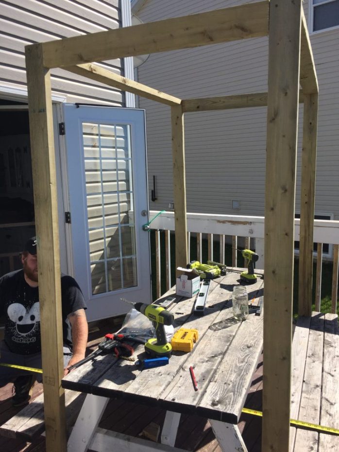 After a quick trip to the store for pressure-treated lumber, he started by attaching four tall “legs” (2x4s) to the picnic table and then connecting them across the top. It looked like a strange outdoor canopy bed.