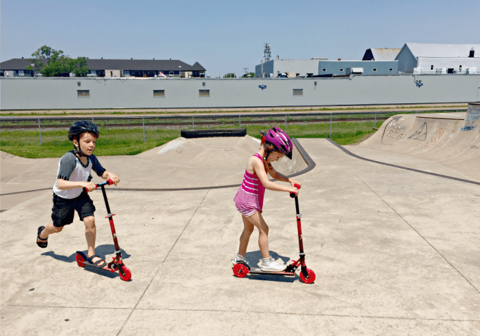 Last summer was The Summer of the Skateboards, so it felt fitting to give into their pleading for “real” scooters (a.k.a. not the plastic three-wheeled one that was too small for even our tiny six-year-old). So we’ve been sweating it out at the skate park, the junior high parking lot, and on the sidewalks. Sweaty, sweaty scooting.