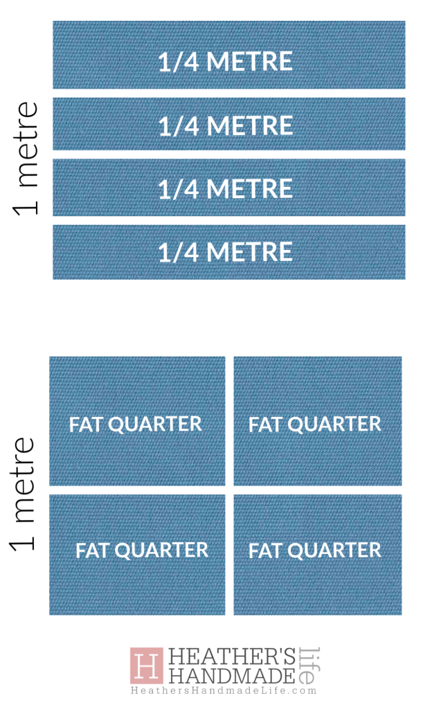 People who sew use a term called a “fat quarter,” which refers to a quarter-metre of fabric if you cut it into squares instead of strips. Fabric stores even sell pre-cut “fat quarters” because they’re handy for making small projects. If you were to buy a quarter-metre off a bolt, it would be a long skinny strip instead of one fat square. Make sense?