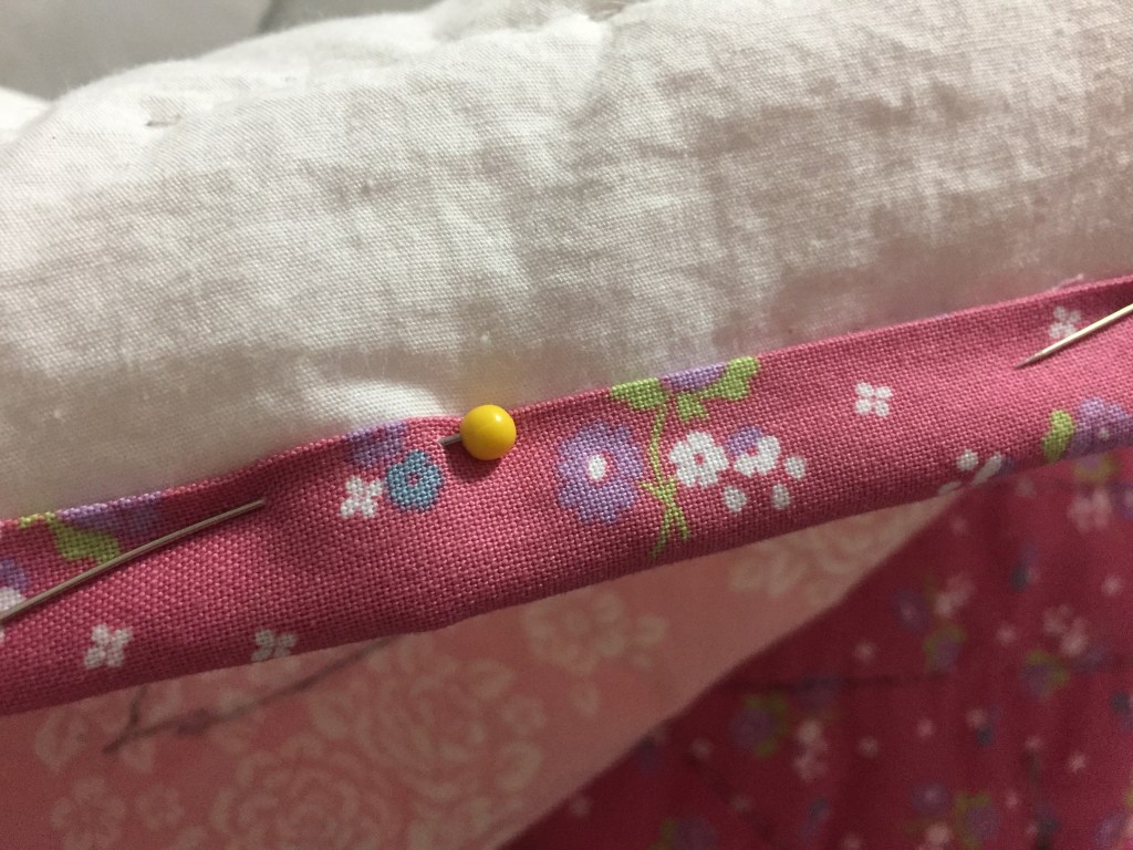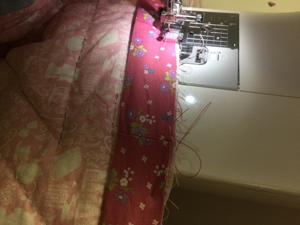 When the quilting was finished, I bought a little more of the deep pink Anne fabric, cut it into skinny strips and sewed the strips together to make the binding. Basically you line up the binding and the edge of the quilt (right sides together) and machine-stitch all the way around …