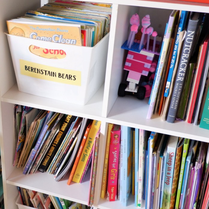 Her bookcase was too small, so I swapped it for a larger cube system and added labelled bins for the books I wanted to keep separate — the rest can be shoved anywhere in the cubes. That worked well.