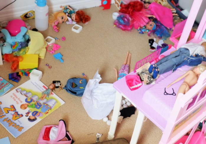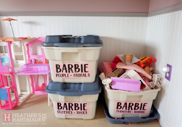 Her Barbie stuff was out of control, so I dragged in three massive storage totes that would allow her to dump everything inside when she was finished playing. That’s also worked well.