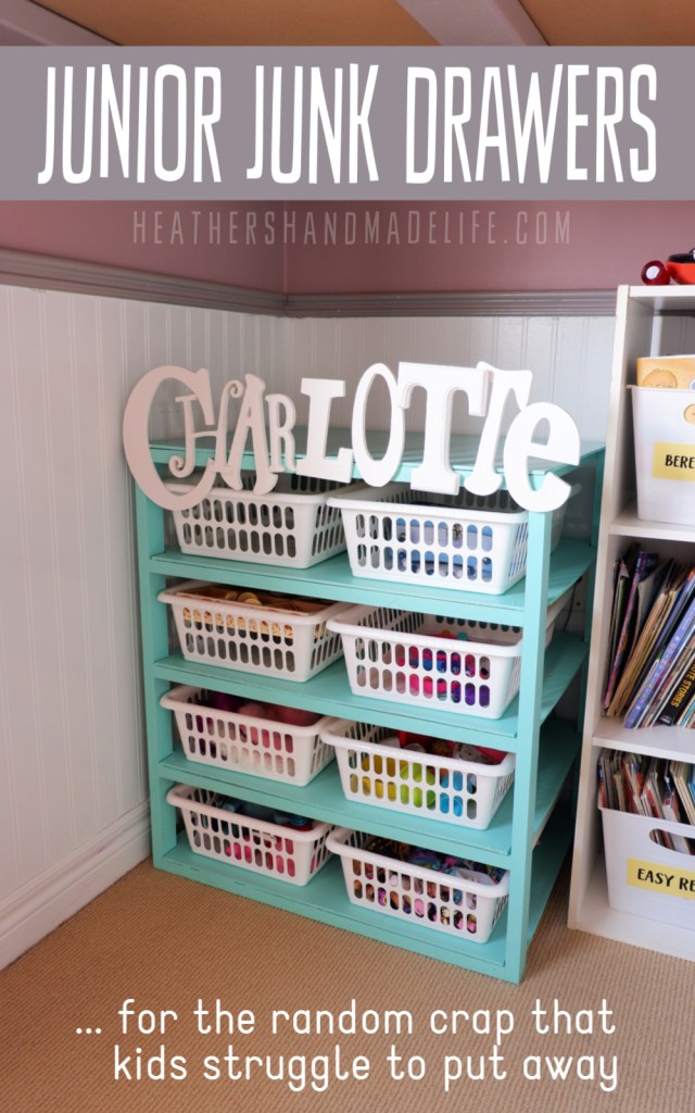It’s true. Adults have junk drawers and junk baskets and the freedom to put our crap wherever we want because we’re adults. Kids should have a place to quickly shove things — not everything, but some things — that don’t seem to have a place.