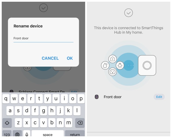 Now your deadbolt is paired with your hub, so you can use the SmartThings (Samsung) app anytime to check to see the current status of your door (whether it’s locked or unlocked), and tap it to lock it or unlock it.