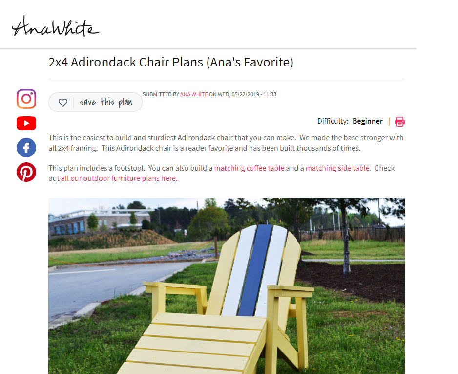 We always love Ana White’s easy-to-follow woodworking plans, so I popped over to her site and grabbed the free plans for her classic 2×4 Adirondack chair.