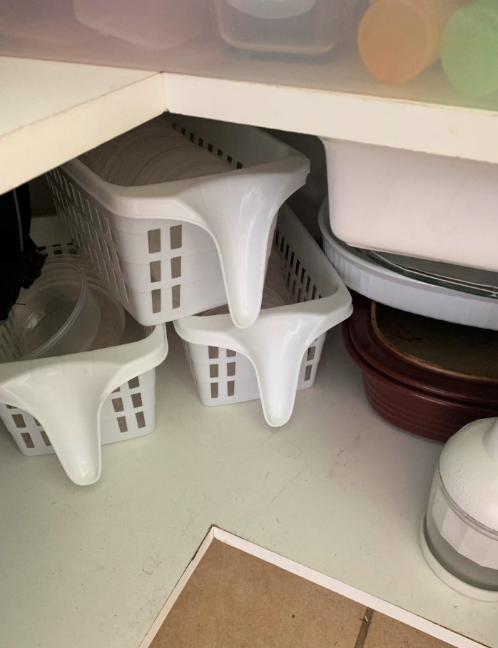 So while we need those containers (and occasionally use them in the kids’ lunches for a bagel or something), I decided I should keep them down below where I can just grab them if I need them.