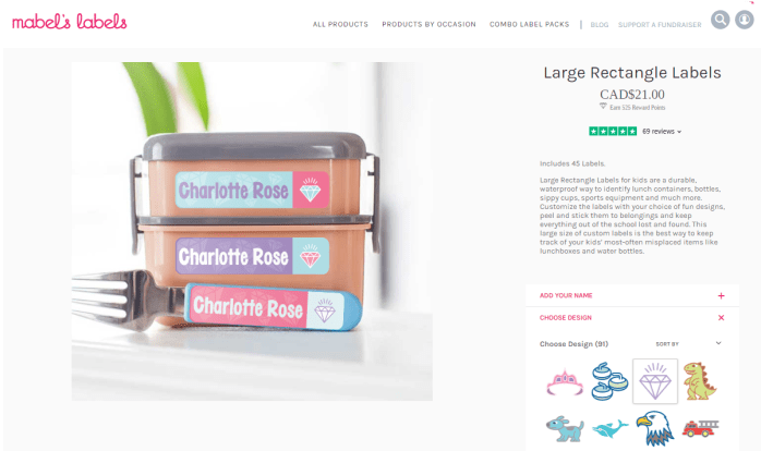 Every summer, I go online and order a new batch of Mabel’s Labels. (Not sponsored — I pay for them and love them to bits.) I don’t even get the kids’ input, lol! I happily spend half an hour looking through the different colours and designs — and playing with the different fonts for their names.