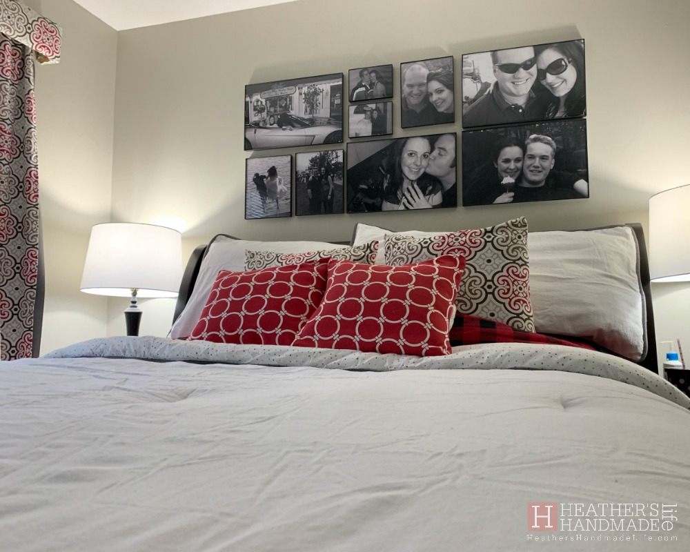 I had my Handy Husband repaint the walls — Revere Pewter, when it was just starting to be THE paint colour everyone wanted — but we kept the black and white gallery wall and the bedding.