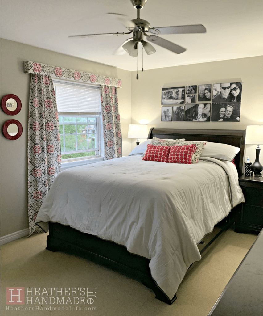 Within a couple of weeks, I’d sewn new curtains (a white, grey, and red print I’d fallen in love with) we’d built pelmet boxes to go above the windows (oooooh, felt so fancy), I’d sewn new throw pillows to match the curtains, and I’d painted some clearance mirrors red and hung them between the windows. We went back to our grey coverlet and kept the gallery wall.