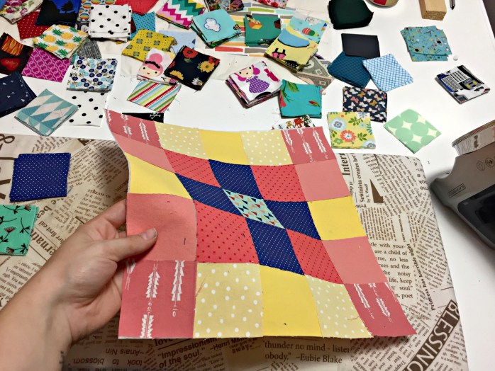 I put the interfacing bumpy side up (meaning the gluey part was up) and had fun arranging a 5×5 grid of colourful little squares.